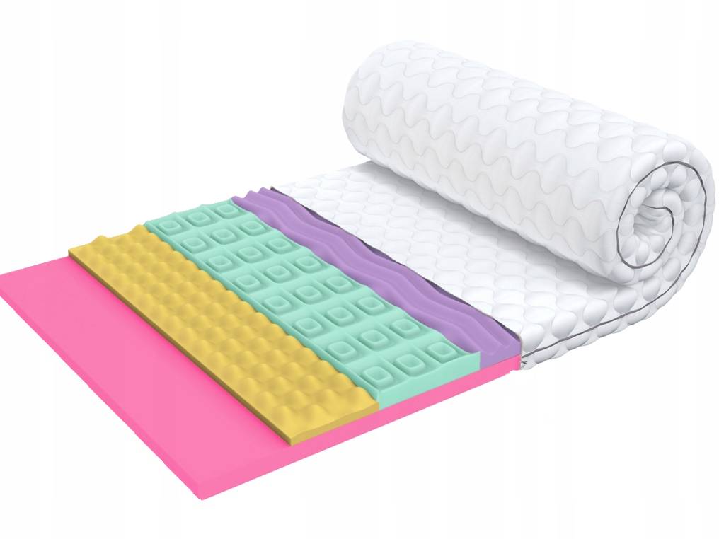 - Profilowana 7-strefowa pianka T30- grubość 4,5 cm. Gwarantuje ona optymalną elastyczność punktową. Dzięki temu materac jest doskonale wentylowany, stosunkowo lekki oraz perfekcyjnie dopasowuje się do kształtu ciała. Szereg cięć tworzy 7 stref podparcia, które dopasowują się idealnie do anatomicznego kształtu ciała. Pianka w kolorze różowym.
