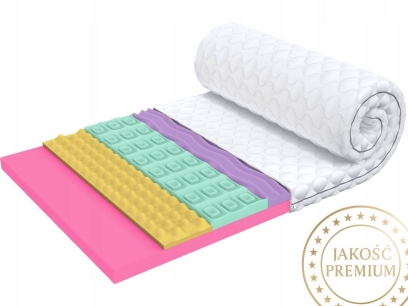 - Profilowana 7-strefowa pianka T30- grubość 4,5 cm. Gwarantuje ona optymalną elastyczność punktową. Dzięki temu materac jest doskonale wentylowany, stosunkowo lekki oraz perfekcyjnie dopasowuje się do kształtu ciała. Szereg cięć tworzy 7 stref podparcia, które dopasowują się idealnie do anatomicznego kształtu ciała. Pianka w kolorze różowym.
